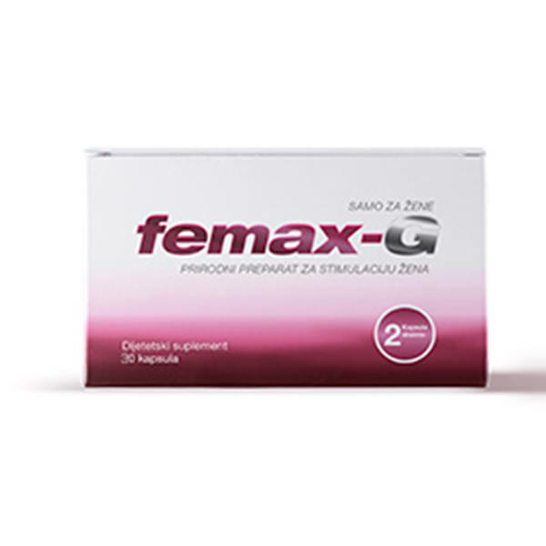 Femax tablete za povećanje libida kod žena dolaze u pakovanju od 30 kapsula. Upotrebljava se tako što se piju po dve kapsule dnevno. Usled svakodnevnog umora i stresa većina žena pati od smanjenog libida, a to uzrokuje pad estrogena u telu. Estrogen je hormon koji pomaže u održavanju zdravlja vaginalnog tkiva i podstiče seksualnu želju. Tokom godina i menopauze nivo estrogena značajno opada i dovodi do smanjenja želje za seksom i suvoće vaginalnog tkiva, što je rezultat bolnog i neugodnog seksualnog odnosa ili nemogućnost da se doživi orgazam mogu umanjiti želju sa samim seksom. Femax tabletesu napravljene od stručno odabranih biljnih sastojaka koji utiču na povećanje seksualne želje i uzbuđenje kod žena. Podstiču cirkulaciju-prokrvljenost ženskih genitalija i pojačana je osetljivost koja povećava želju sa seksom i pomaže da se ostvari veći užitak. Femax tablete na potpuno prirodan način održavaju nivo estrogena u organizmu i samim tim otklanjaju suvoću vagine i jačaju seksualnu funkciju. Ne sadrži hormone, poboljšava osećaj mentalnog i fizičkog stanja. Redovnom upotrebom preparata Femax vaš seksualni život će postati intezivniji a samopouzdanje će rasti. Rezultati neće izostati, a vaš partner će osetiti i uživati u razlici.Sadržaj aktivnih komponenata: suvi ekstrakt korena make, suvi ekstrakt semena guaran, koren đumbira u prahu, plod kima u prahu, keton maline i cink. Za pregled svih proizvoda pogledajte kategoriju Afrodizijaci i Sexy Kreme.