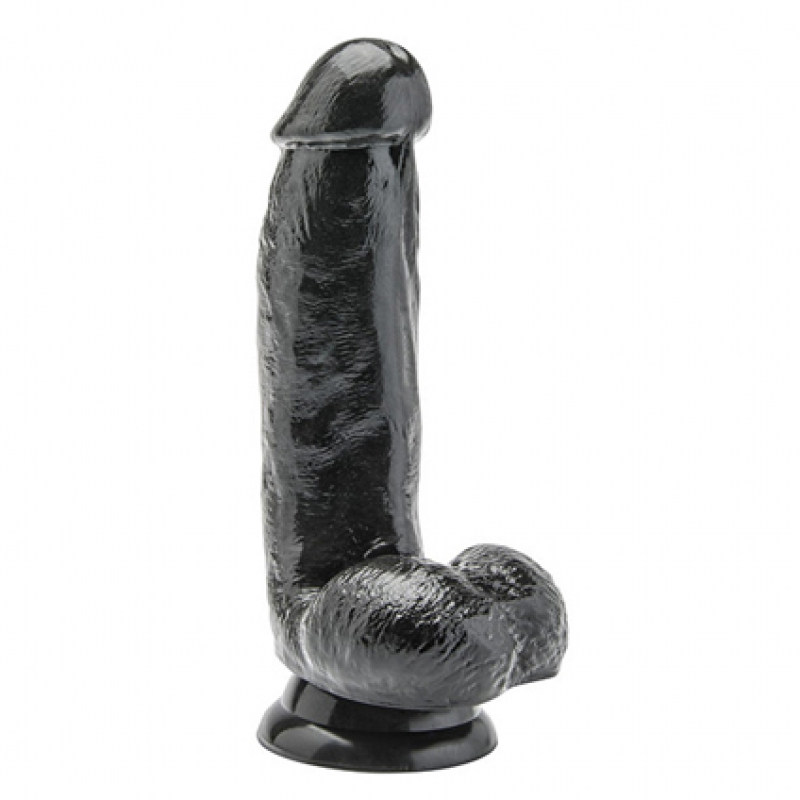 Veliki dildo u crnoj boji, verna kopija pravog penisa, detaljan je kao pravi penis, ima blago izražene vene po sebi, poseduje i testise. Veliki dildo je napravljen od silikonskog materijala, potpuno je prijatan na dodir. Baza, donji deo dilda se lako postavlja na većinu glatkih površina, još lakše održava. Dimenzije ovog realističnog dilda, dužina 28cm, a prečnik 6,4cm. Preporučujemo upotrebu lubrikanta na bazi vode radi prijatnije i udobnije penetracije.Za pregled svih proizvoda pogledajte kategoriju dildo.