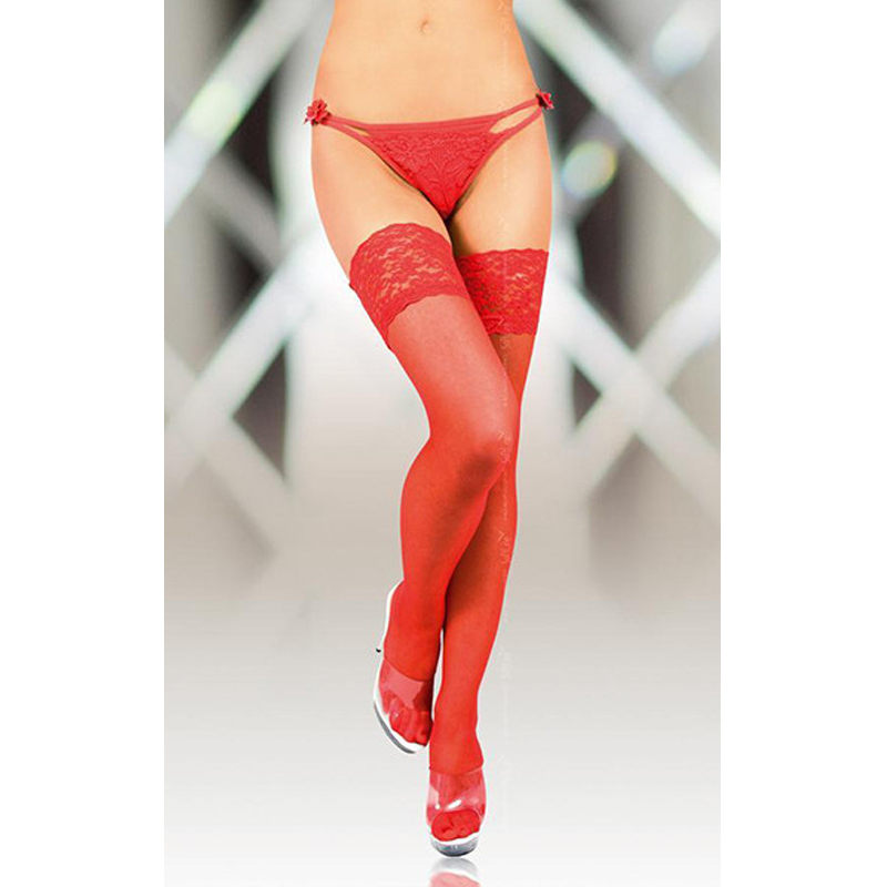 Crvene samodržeće čarape su namenjene samo za one dame koje znaju šta žele da probude kod svog partnera. Idealno će se uklopiti uz neku sexy haljinu i štikle. Veoma su komforne i rastegljive. Napravljene su od 82% poliamida i 18% elastina. Veličine koje su dostupne: 2 i 4