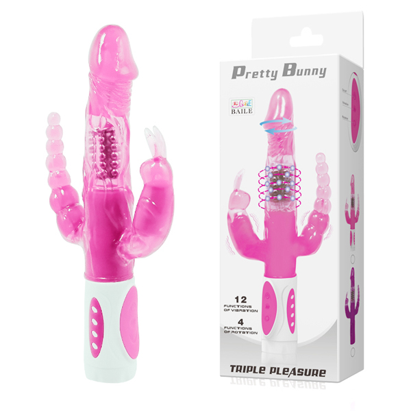 Vibrator u sexy roze boji ima dva dodatka i glavni deo koji vrši glavnu penetraciju i to ga čini zavodnikom sa trostrukom stimulacijom. Oseti kako ovaj sexy vibrator izaziva neverovatne senzacije anusu, vagini i klitorisu istovremeno i ostaćeš bez teksta. Pokreću ga tri standardne AAA baterije od 1,5v i preporučuje se upotreba lubrikanta na bazi vode pri svakoj penetraciji i magičnoj stimulaciji. Analni dodatak je dizajniran od povezanim analnih kuglica dok je sexy dodatak za stimulaciju klitorisa u obliku zeke. Vibrator ima dužinu od 23cm ali deo koji vrši penetraciju iznosi 13cm i prečnika je 3cm. Uživaj u analnom seksu jer analni dodatak ima dužinu od 8cm i sasvim je dovoljno da analni sex postane veoma interesantan. Poseduje dvanaest različitih modova vibracije koje samo na tebe čekaju da ih otkriješ i učiniš da tvoja vagina konačno dobije ono što zaslužuje dok možeš uživati i u rotaciji koju takođe poseduje ova fantastična sexy spravica. Naruči vibrator silikonskog materijala koji će ostariti sve tvoje snove. Celokupan asortiman vibratora možete pogledati klikom na stranicu vibratori.